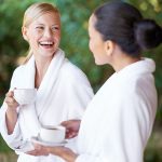 Two young women having coffee in their bathrobes at the spa