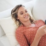 Shot of a woman opening a gift at home